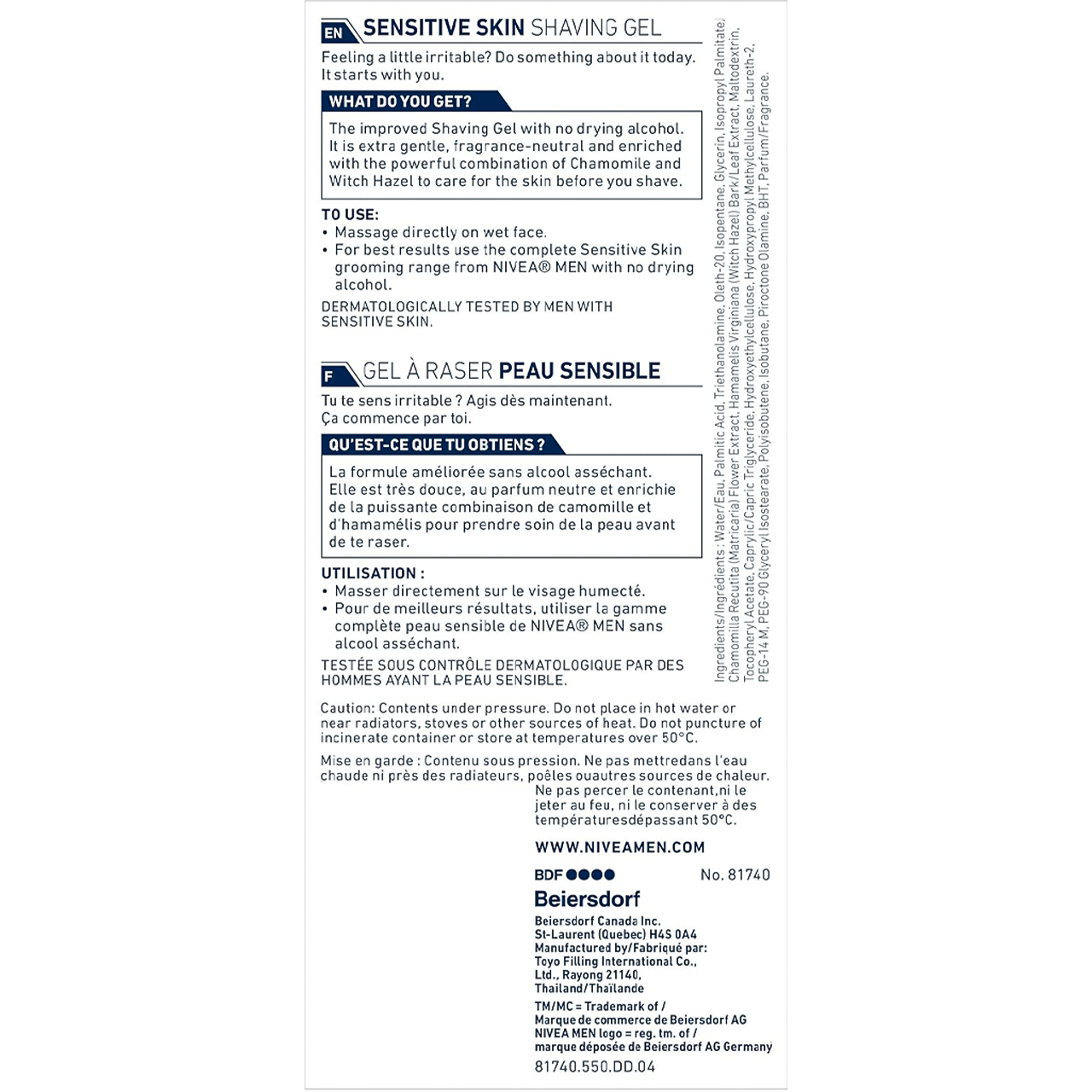 Nivea Men - Gel de rasage apaisant instantané pour peaux sensibles à la vitamine E | 200 ml VendeurNivea Partagez ce produit WhatsApp Facebook X Pinterest Messenger Email Fiche produit Ramassage gratuit dans notre magasin Ramassage gratuit dans notre magasin SKU: 07214081740 4 en stock $6.49 Quantité Ajouter au Panier Cet article constitue un achat récurrent ou différé. En continuant, j’accepte la politique de résiliation et vous autorise à facturer mon moyen de paiement aux prix, fréquences et dates listées sur cette page jusqu’à ce que ma commande soit traitée ou que je l’annule, si autorisé. Caractéristiques Apaisement instantané pour les peaux sensibles.Enrichi en vitamine E.Glisse du rasoir douce et facile.Ne laisse aucun résidu collant.