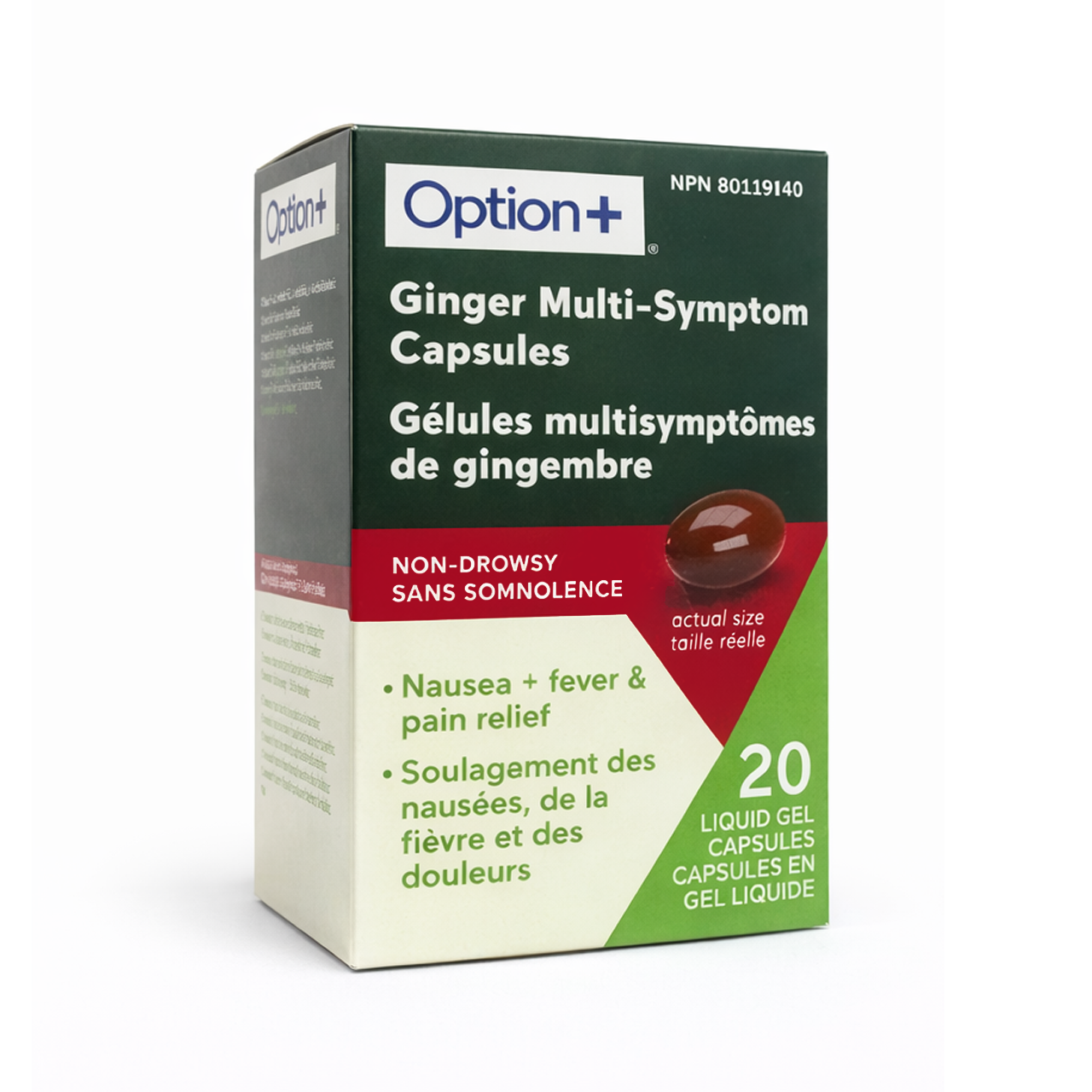 Option+ Gélules multi-symptômes au gingembre, sans somnolence | 20 gélules de gel liquide