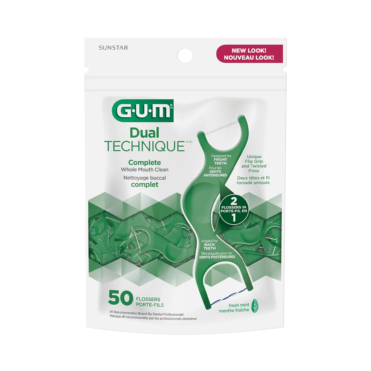 GUM - Dual Technique 2IN1 Flossers, Fresh Mint | 50 Count BrandGUM Share WhatsApp Deel X Pin it Messenger Email Product form Free pickup in store Free pickup in store SKU: 07094200459 9 in stock $3.99 Quantity Add to cart This item is a recurring or deferred purchase. By continuing, I agree to the cancellation policy and authorize you to charge my payment method at the prices, frequency and dates listed on this page until my order is fulfilled or I cancel, if permitted. Features Two flosser heads designed to clean front teeth and far reaching back teeth.Preloaded with shred-resistant, mint-flavored GUM dental floss.Fits gently into the narrow spaces between teeth and below the gumline to disrupt plaque.Easy to use handle with comfortable wide thumb grip, allows for quick and precise access to the whole mouth.