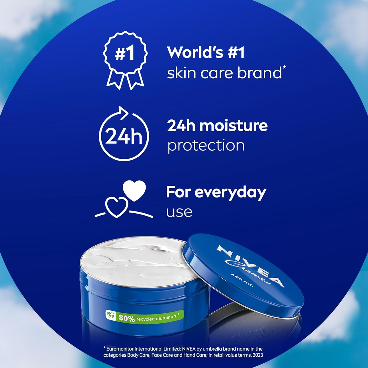 Save -$4.00 Nivea - Creme All-Purpose | 400 mL BrandNivea Share WhatsApp Deel X Pin it Messenger Email Product form Free pickup in store Free pickup in store SKU: 62025021201 12 in stock $14.99 $10.99 Quantity Add to cart This item is a recurring or deferred purchase. By continuing, I agree to the cancellation policy and authorize you to charge my payment method at the prices, frequency and dates listed on this page until my order is fulfilled or I cancel, if permitted. Earn [points_amount] when you buy this item. Features Intensive care for dry skin.Suitable for face, hands, and body.Enriched with Eucerit for hydration.Dermatologically approved formula.Classic, multi-purpose moisturizer.Iconic blue tin packaging.