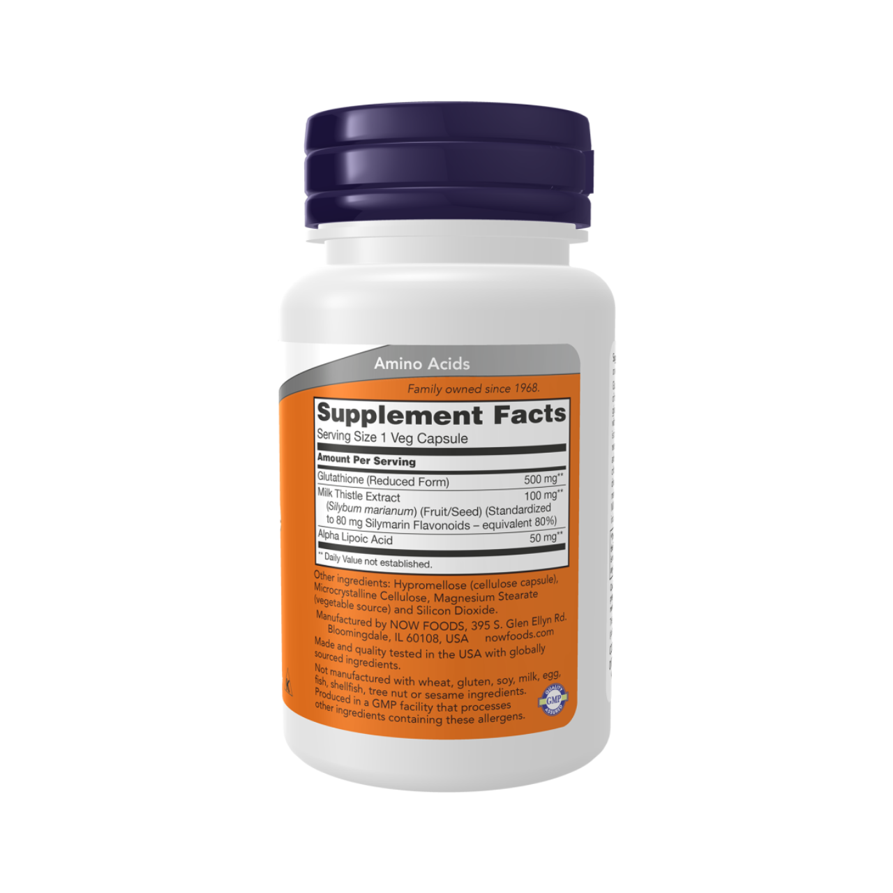 NOW Glutathione 500 mg, combined with Milk Thistle Extract and Alpha Lipoic Acid, is a powerful free radical neutralizer that supports healthy aging and cellular health. Glutathione, a potent antioxidant, is critical for immune system function and proper detoxification processes. This supplement helps maintain the activity of vitamins C and E and promotes overall health by neutralizing harmful free radicals. With GMP quality assurance, this product is family-owned and proudly packaged in Canada.