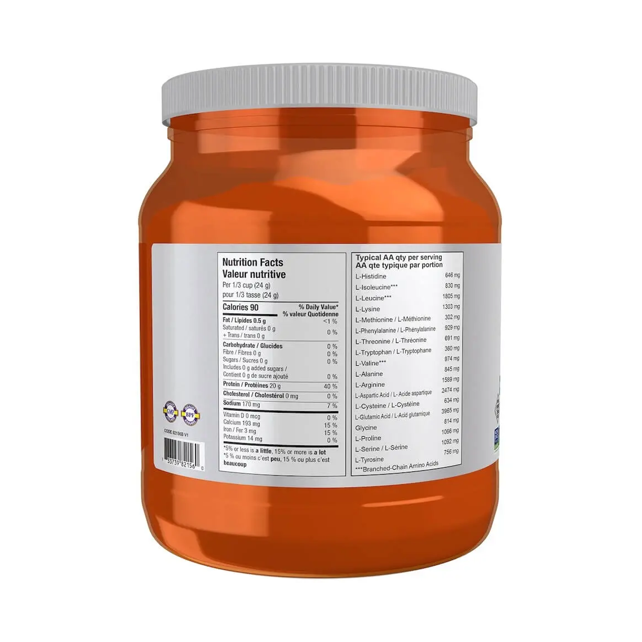 Protein 20 g, Sodium 170 mg, Calcium 193 mg, Iron 3 mg, Potassium 14 mg, L-Histidine 646 mg, L-Isoleucine 830 mg, L-Leucine 1805 mg, L-Lysine 1303 mg, L-Methionine 302 mg, L-Phenylalanine 929 mg, L-Threonine 691 mg, L-Tryophan 360 mg, L-Valine 974 mg, L-Alanine 845 mg, L-Arginine 1589 mg, L-Aspartic Acid 2474 mg, L-Cysteine 634 mg, L-Glutamic Acid 3965 mg, Glycine 814 mg, L-Proline 1066 mg, L-Serine 1092 mg, L-Tyrosine 756 mg.