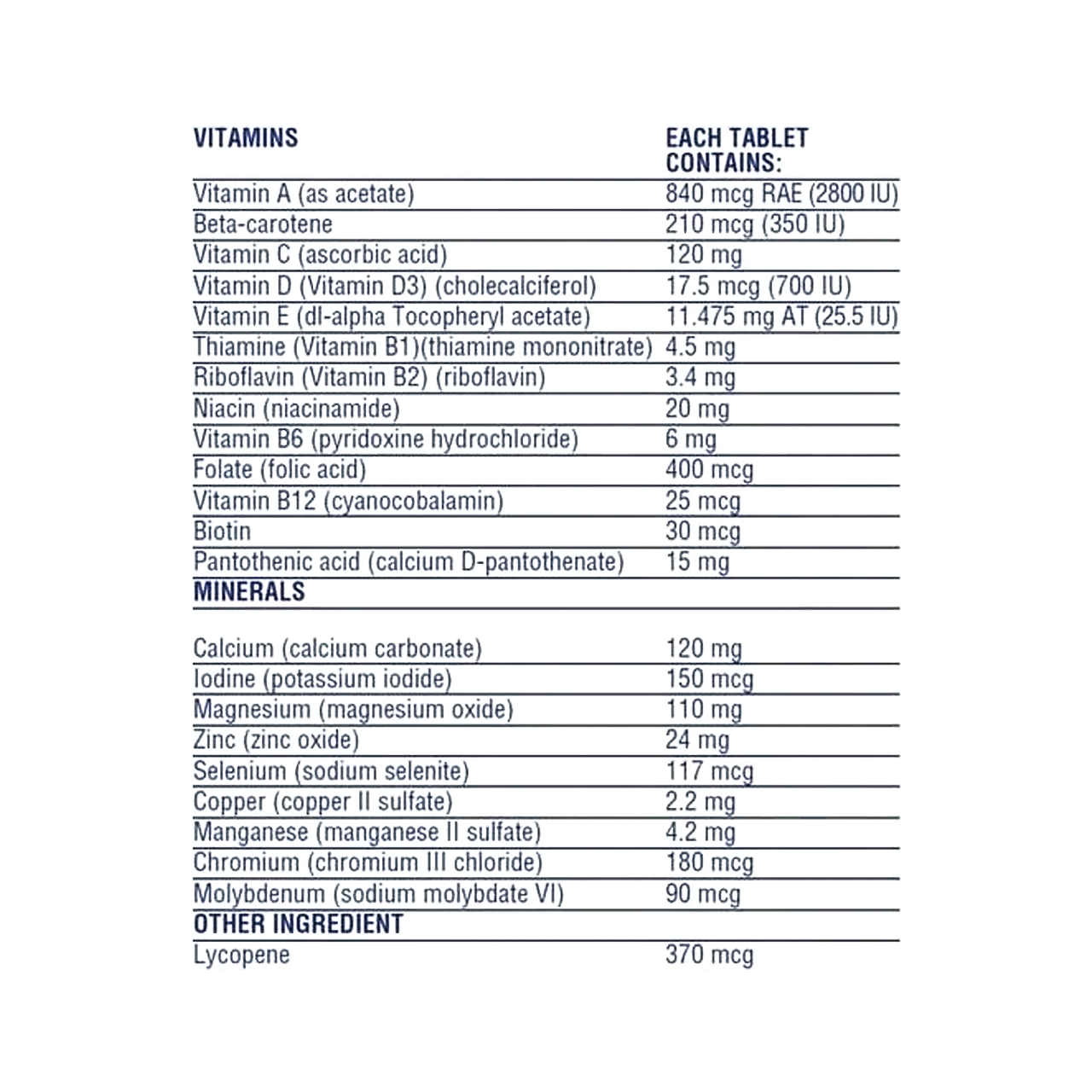 Vitamin A 2700 IU, Beta-Carotene 300 IU, Vitamin C 99 mg, Vitamin D 1000 IU, Vitamin E 33.3 IU, Vitamin B1 1.32 mg, Vitamin B2 1.43 mg, Niacinamide 17.6 mg, Vitamin B6 2.17 mg, Folate 240 mcg, Vitamin B12 6.24 mcg, Biotin 43 mcg, Pantothenic Acid 15.5 mg, Calcium 210 mg, Iodine 150 mcg, Magnesium 120 mg, Zinc 11 mg, Selenium 55 mcg, Copper 0.9 mg, Manganese 2.3 mg, Chromium 35 mcg, Lycopene 300 mcg.