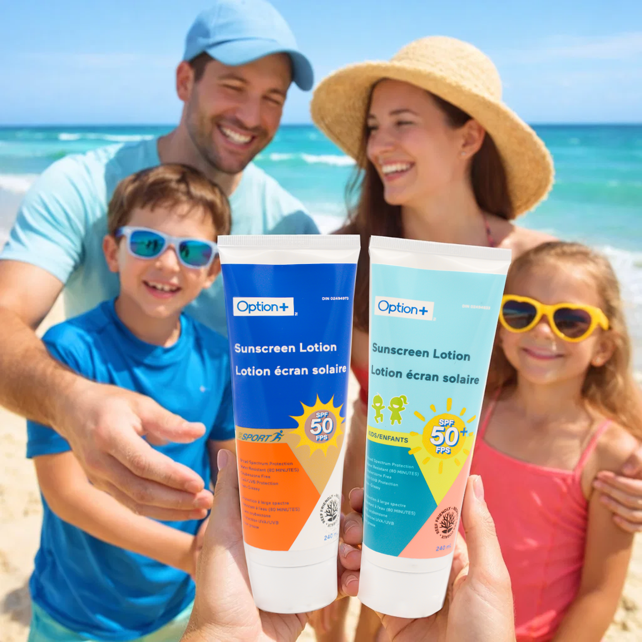 Option+ Sunscreen Sport Lotion SPF 50 provides high broad-spectrum UVA/UVB protection in a non-greasy formula that stays effective for up to 80 minutes during water and sweat exposure.