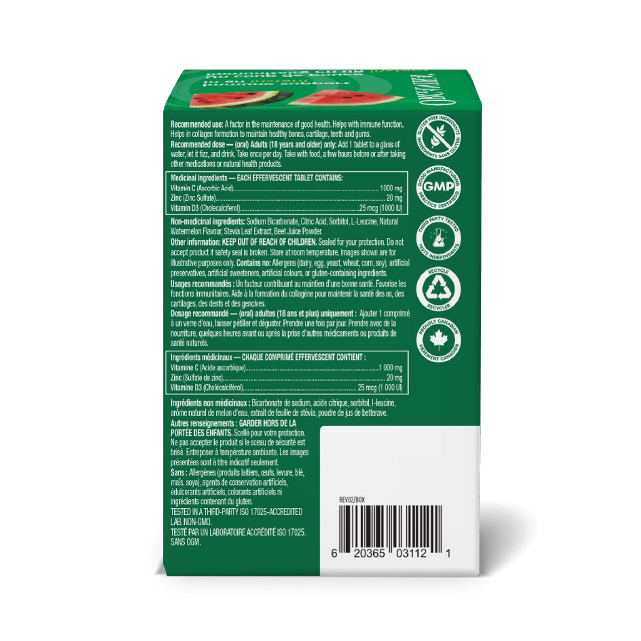 Vitamin C 1000 mg, Zinc 20 mg, Vitamin D3 25 mcg (1000 IU).