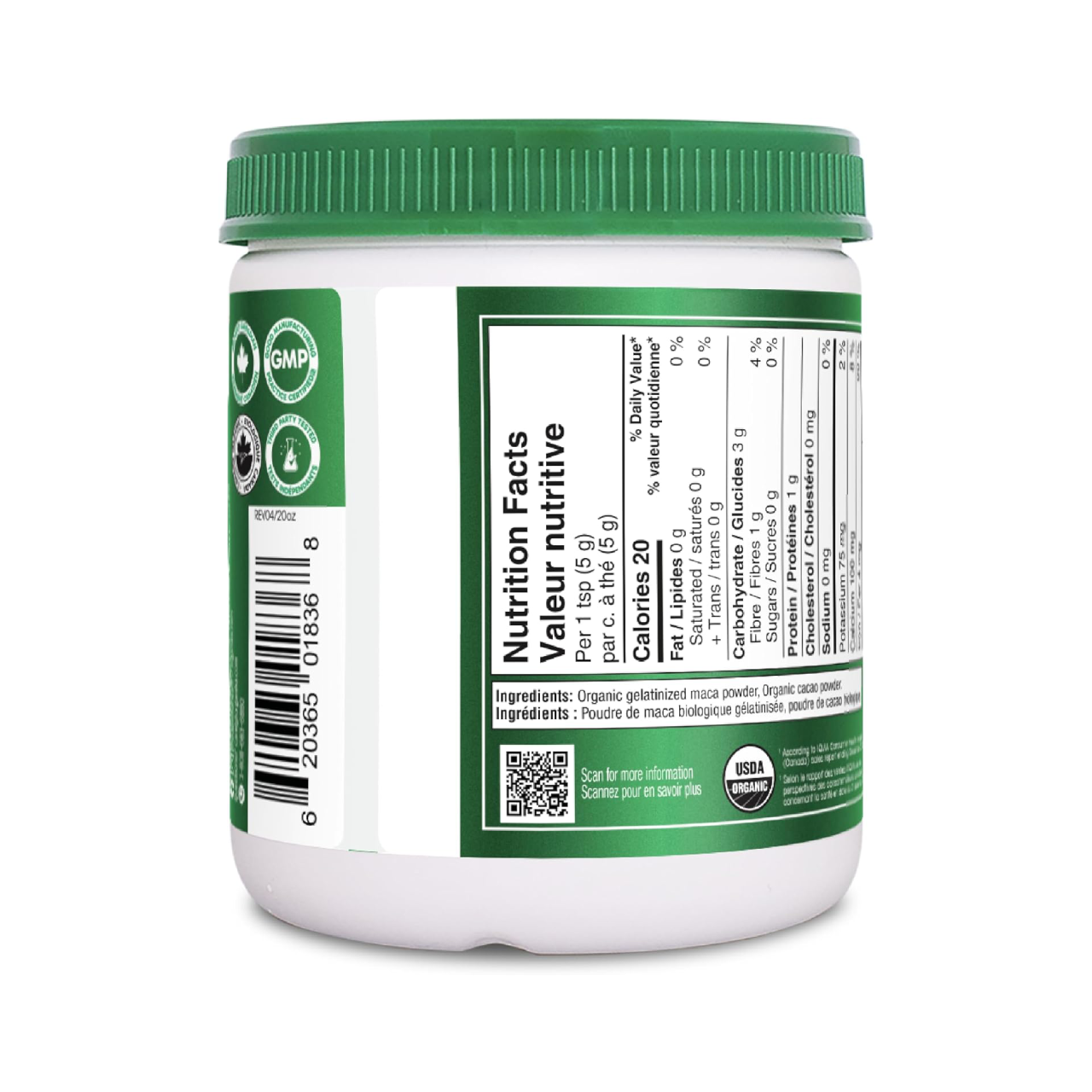 Organic gelatinized* maca powder, Organic cacao powder. *Gelatinization does not involve gelatin in any form. This product is completely vegan friendly.