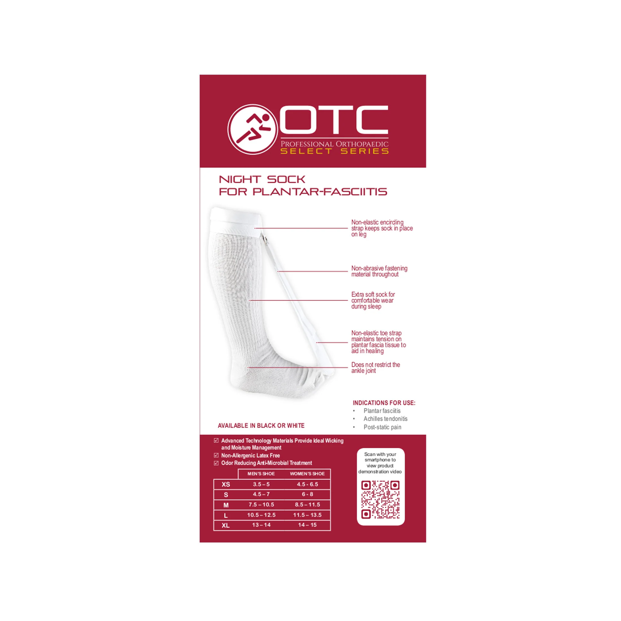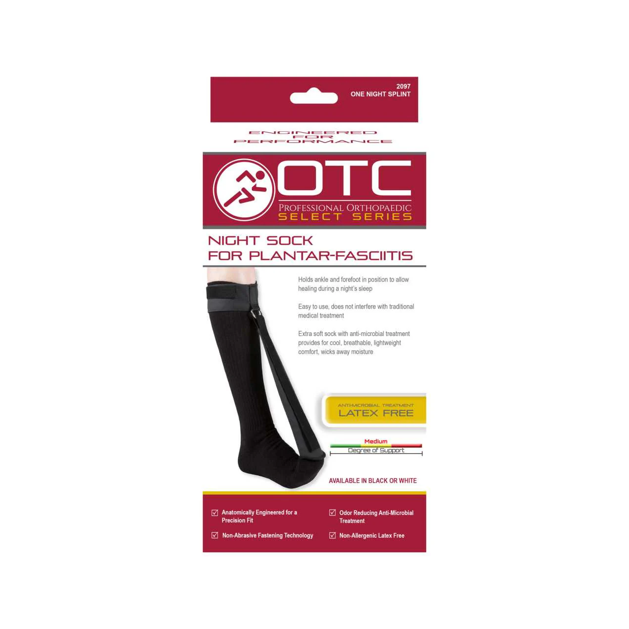 The OTC Select 2097 night sock is designed to maintain tension on the plantar fascia tissue in the foot so it can heal in a stretched position at night. Using it can reduce pain upon rising, overall recovery time and the need for medications. When worn as intended it will prevent the plantar fascia from contracting while in the prone or supine (sleeping) position. The night splint holds the ankle and forefoot in a position of slight dorsiflexion and thus prevents the plantar fascia from contracting, which causes pain.
