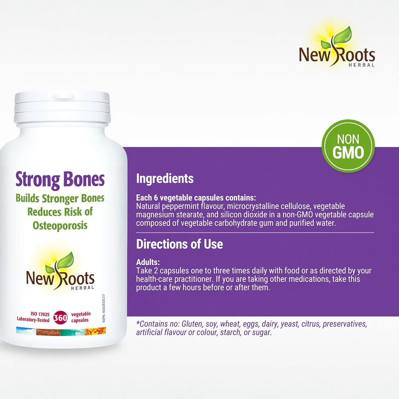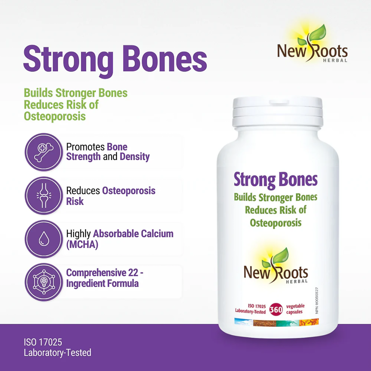 Strong Bones is a comprehensive formula designed to support bone health and prevent osteoporosis, particularly in women. It features microcrystalline hydroxyapatite (MCHA), the most bioavailable form of calcium, along with amino acids, vitamins, and minerals that enhance calcium absorption, support collagen production, and improve bone density. With the addition of glucosamine sulfate, magnesium, vitamin K2, silica-rich horsetail, and powerful antioxidants like curcumin, lutein, and green tea extract, Strong Bones promotes strong, healthy bones and connective tissue.