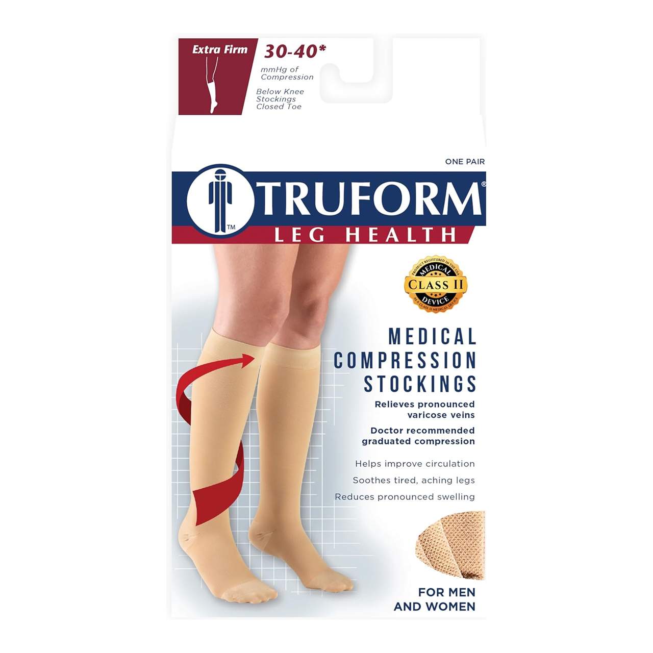 Truform was created to help relieve conditions associated with poor circulation. Graduated compression technology delivers a compressive action to the leg that is greatest at the ankle, then gradually decreases toward the heart. The 30-40 mmHg very firm compression level is great for post surgery and severe edema, varicose veins, spider veins, hypotension, post thrombotic syndrome (PTS), post sclerotherapy, and more.