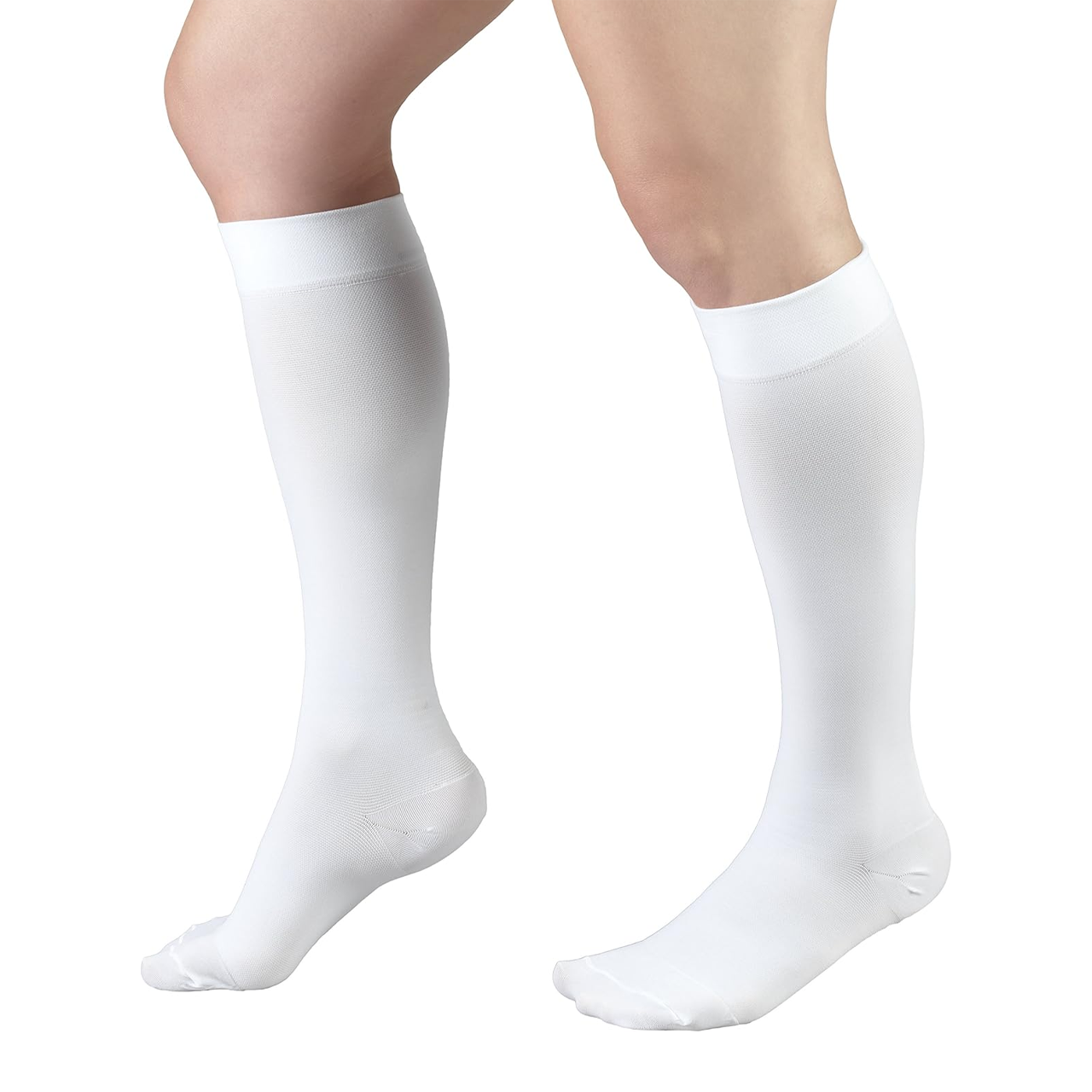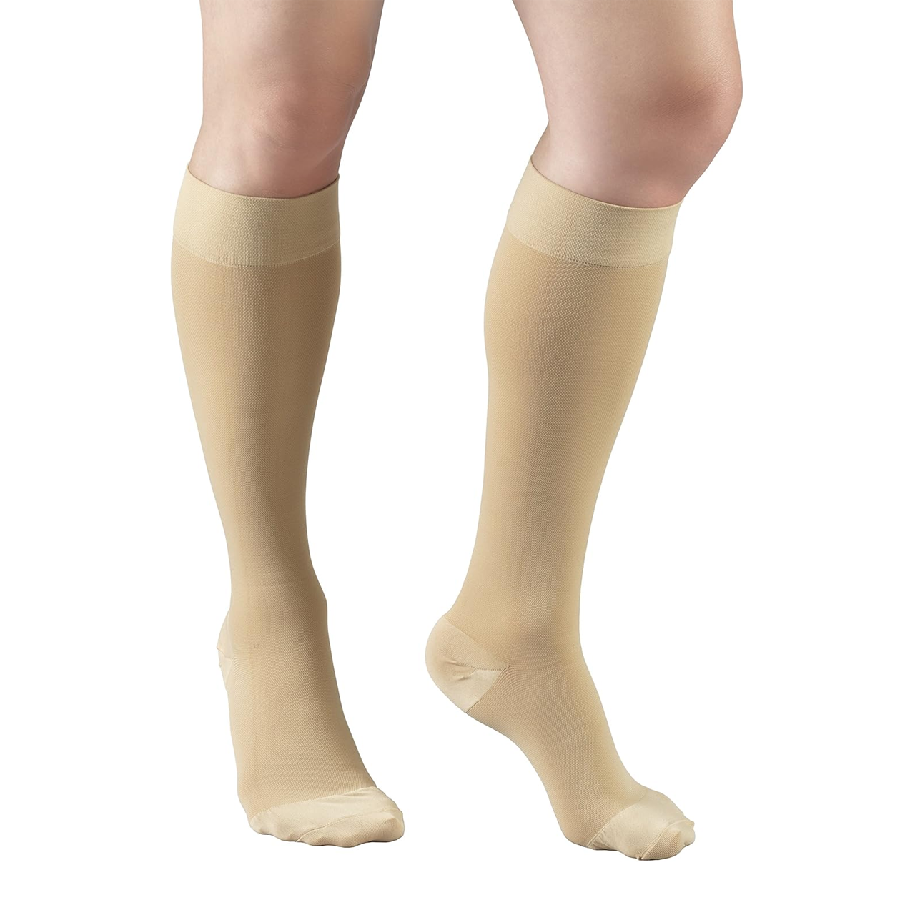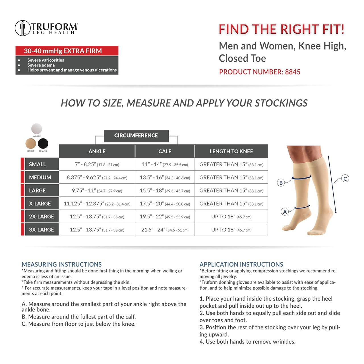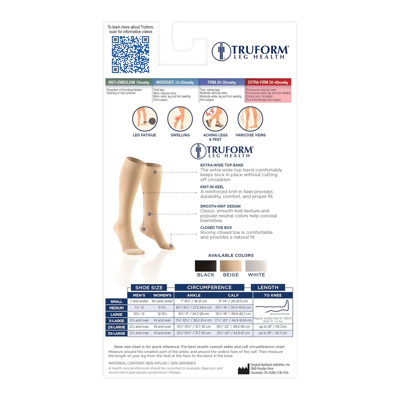 Truform therapeutic stockings feature classic styling and a smooth knit fabric that helps conceal unsightly conditions. The closed toe offers a more natural stocking feel. Color options are basic neutrals for all-occasion wear. Truform stockings, socks and pantyhose feature Graduated Compression Technology, which delivers a compressive action to the leg that is greatest at the ankle, then gradually decreases toward the heart.