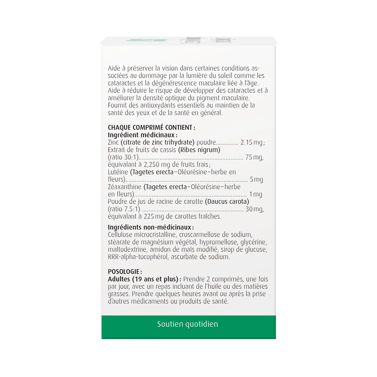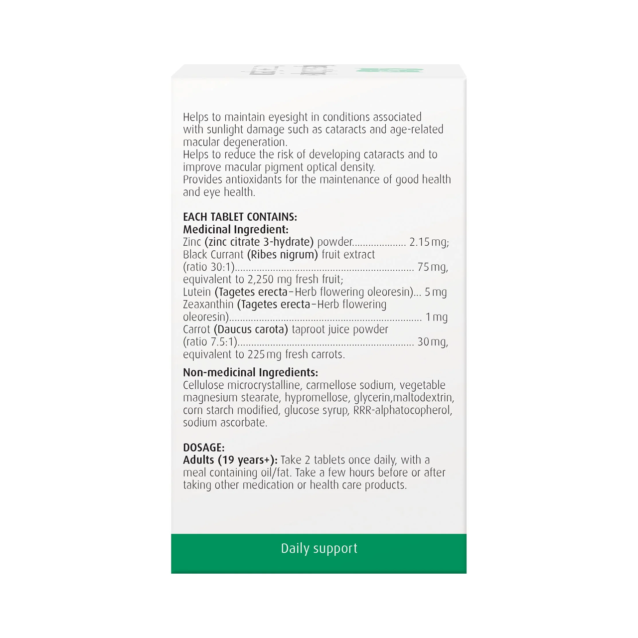 Zinc 2.15 mg, Black currant 75 mg, Lutein 5 mg, Zeaxanthin 1 mg, Carrot 30 mg.
